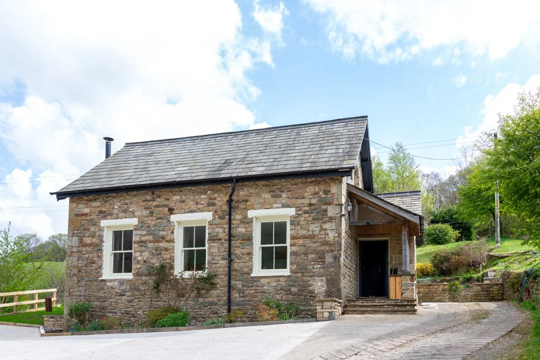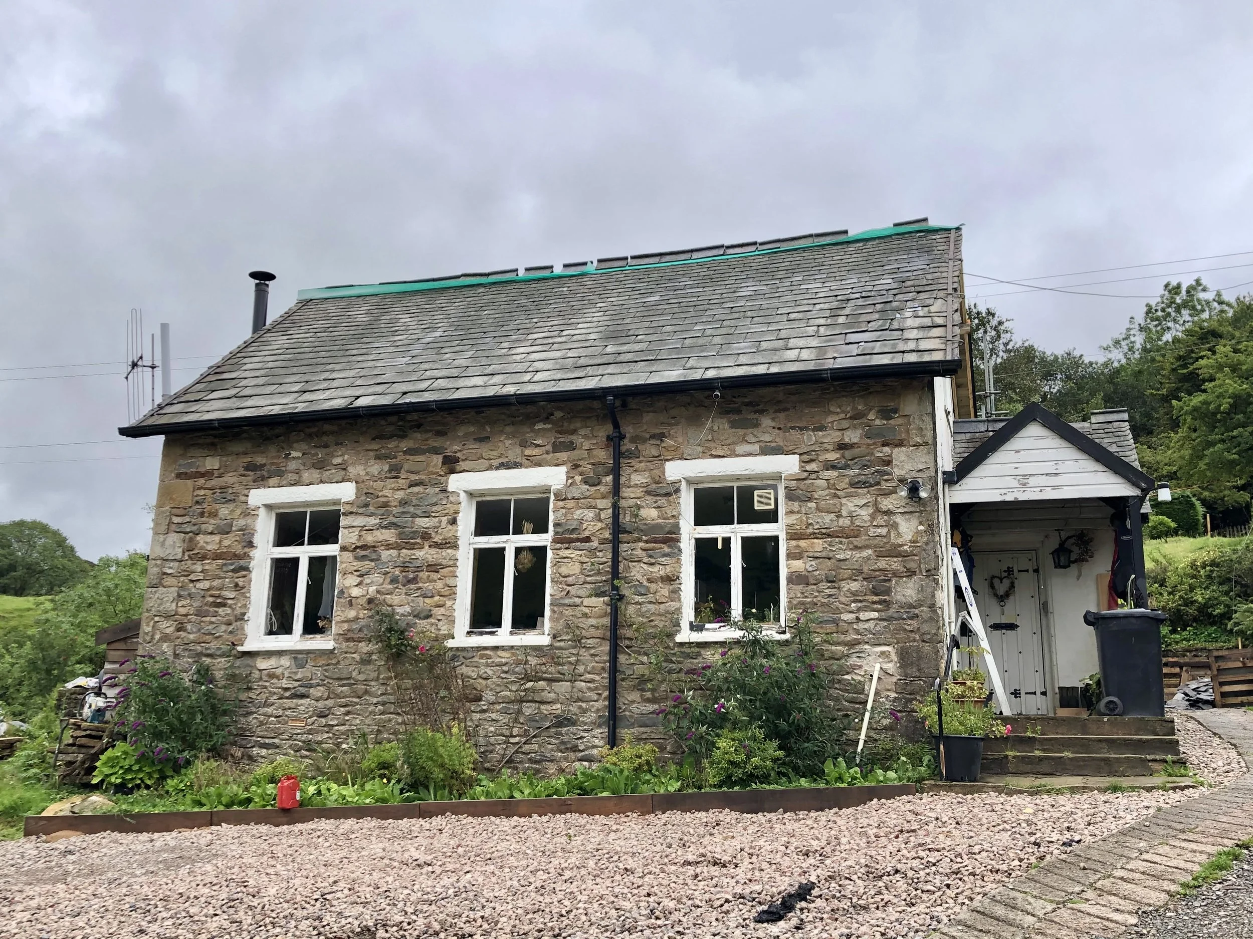 This photo is from 2020, when we’re halfway through re-roofing. These were the windows that were presumably put in when Ridge House was converted from a school into a house in the 1950s. You can see a very subtle change in the pointing and stonework showing where the windows used to sit. These windows were falling apart when we bought the house, so we replaced them with traditional sliding sash timber windows.