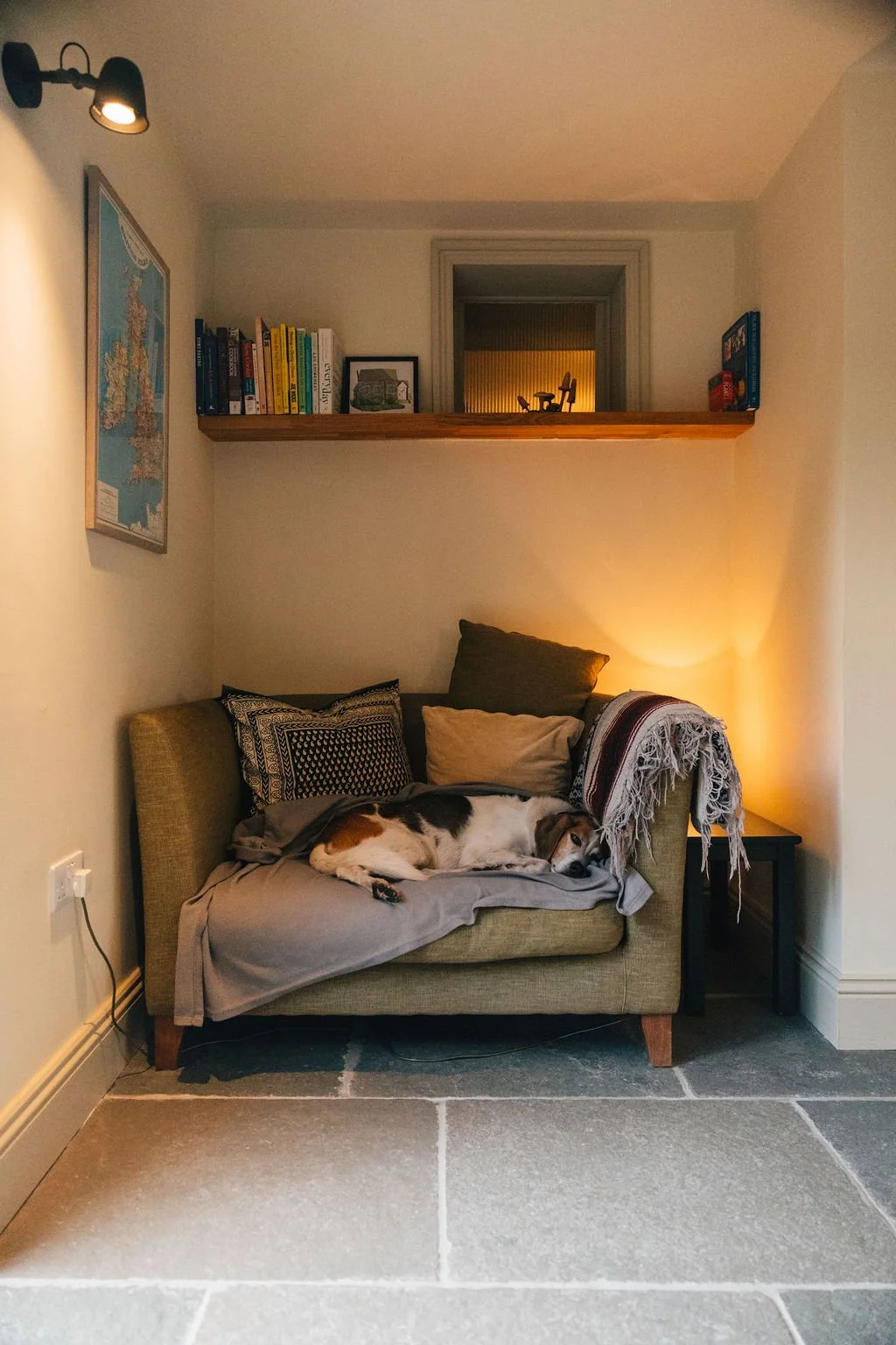 This is the same window from the other side - the cosy reading nook in the kitchen-diner. Jonny cleverly made a new oak window cill for it which spills out into the room to create a floating bookshelf - handy for all those heavy recipe books!