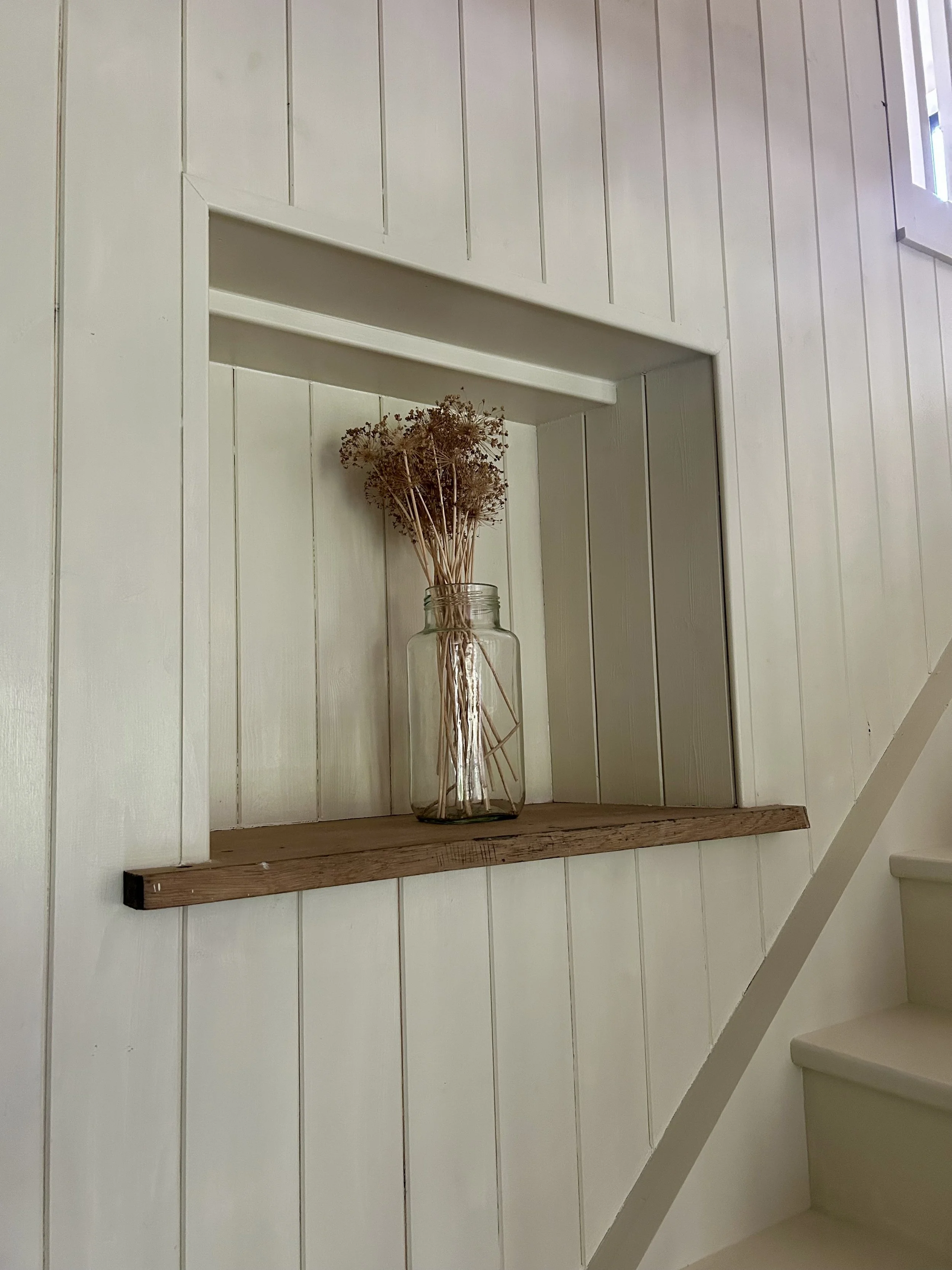 Sadly this window had already been removed - presumably in the 70s when the old flat-roofed extension was built and it became an internal window. So rather than reinstate glass we made it into a little nook or shelf. Given its location halfway up the stairs it is now a magnet for small children to play in (what is it they love about tiny spaces!?)